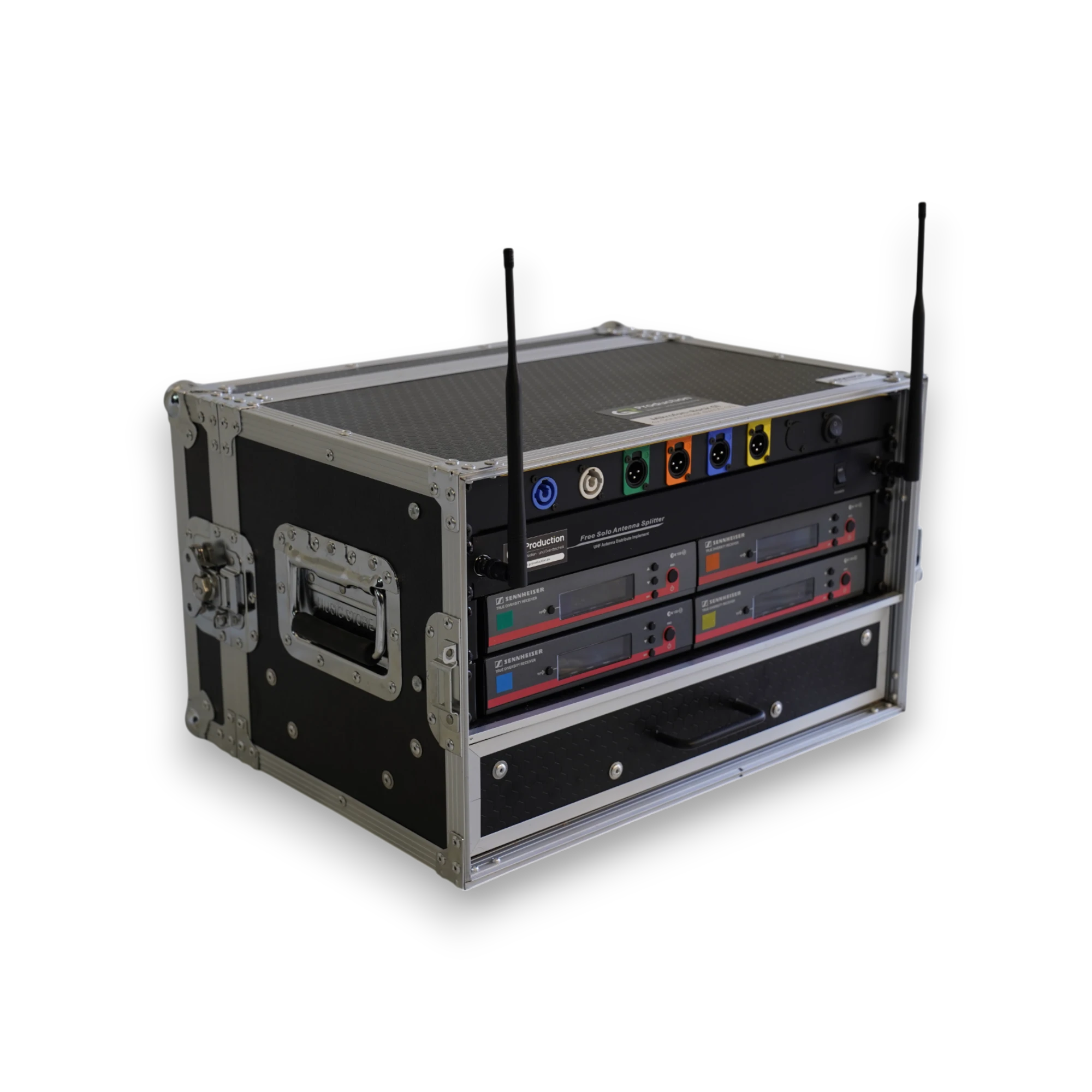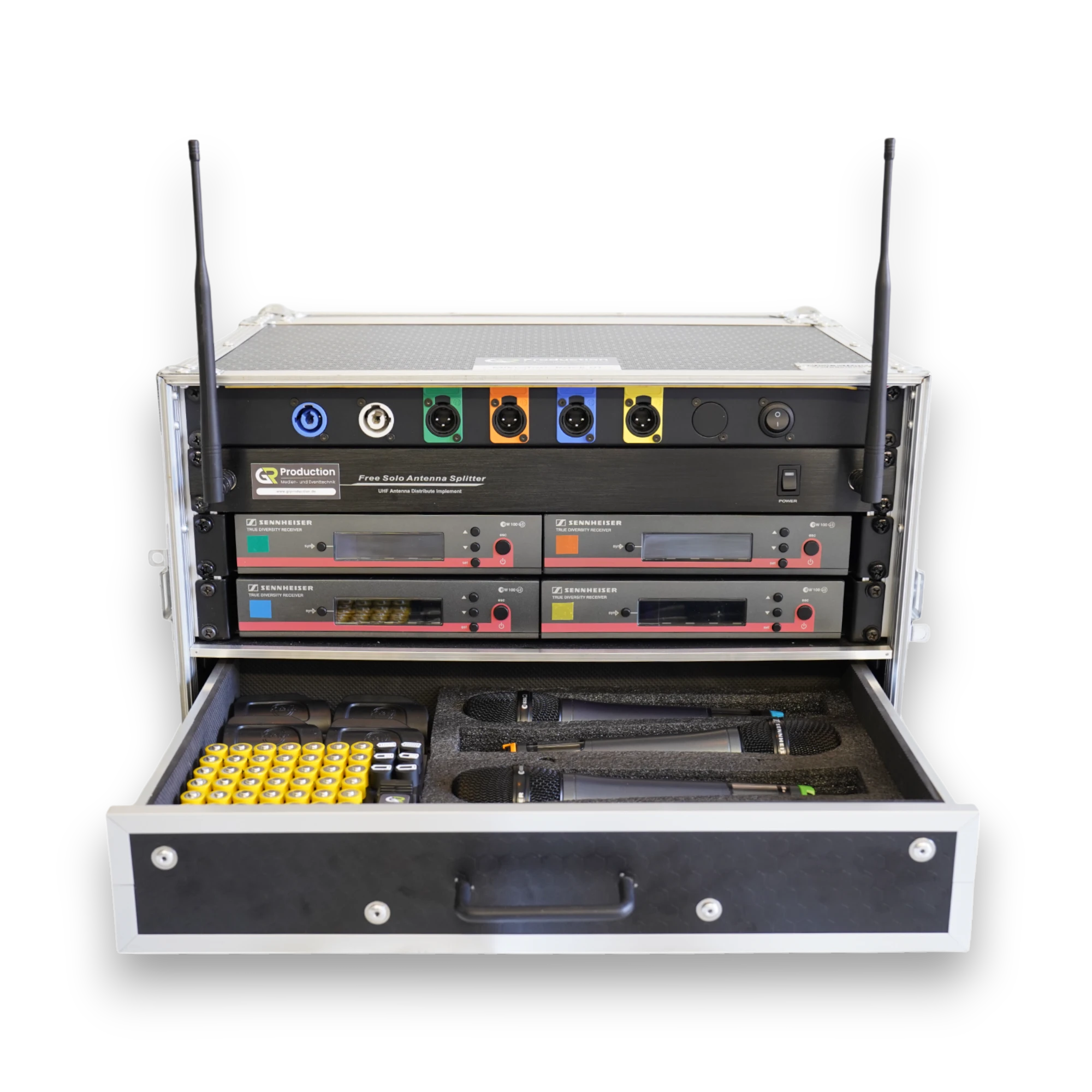 Das gesamte Set ist in einem robusten Rack-Gehäuse untergebracht, das eine integrierte Schublade zur Aufbewahrung der Mikrofone und Batterien enthält. Die Verkabelung ist professionell vorbereitet, mit PowerCON In- und Out-Anschlüssen für eine zuverlässige Stromversorgung. Dank der externen Antennen und hochwertigen Empfänger bietet dieses Set eine stabile und störungsfreie Funkverbindung mit einer großen Reichweite.